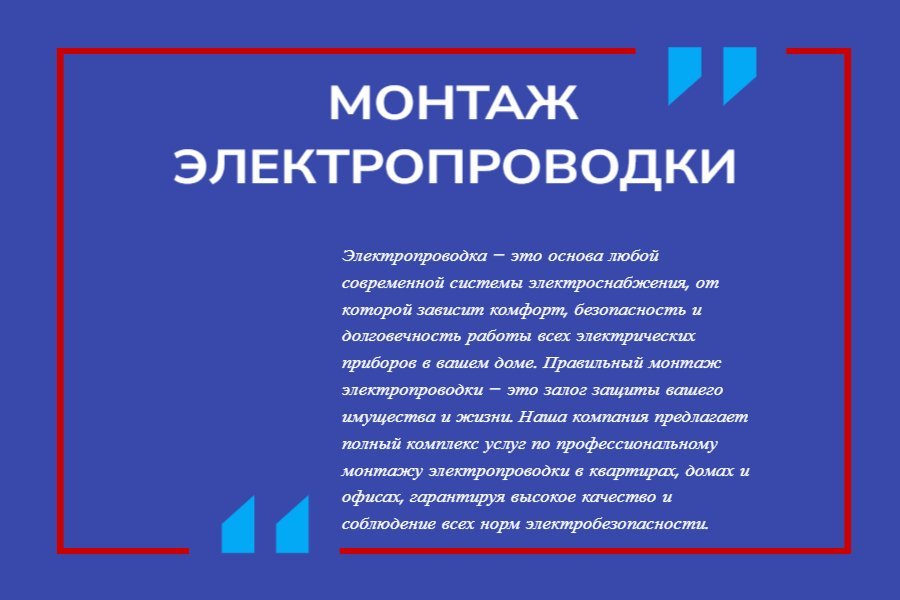 - Индивидуальный подход. Мы учитываем все особенности вашего объекта и ваши пожелания при проектировании и монтаже электропроводки. Наши специалисты помогут вам разработать оптимальный план разводки проводов, учитывая все необходимые мощности и особенности помещений.