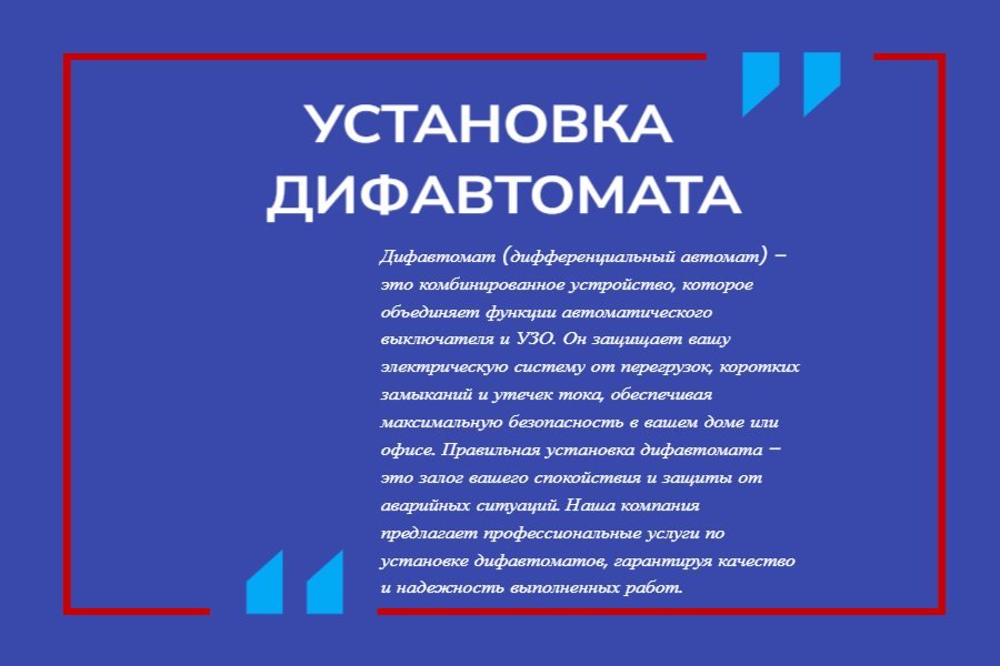 - Качество и надежность. Мы используем только проверенные дифавтоматы от ведущих производителей, что гарантирует долговечность и стабильную работу устройства. Все работы выполняются с соблюдением технических стандартов и норм безопасности, что исключает риск неисправностей и аварий.